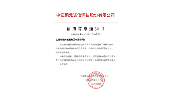 2月9日,中證鵬元資信評估股份有限公司發(fā)布《信用等級通知書》中鵬信評【2024】第Z【179】號,確定鹽城市海興控股集團(tuán)有限公司主體信用等級為 AAA,評級展望為穩(wěn)定。2024-02-09